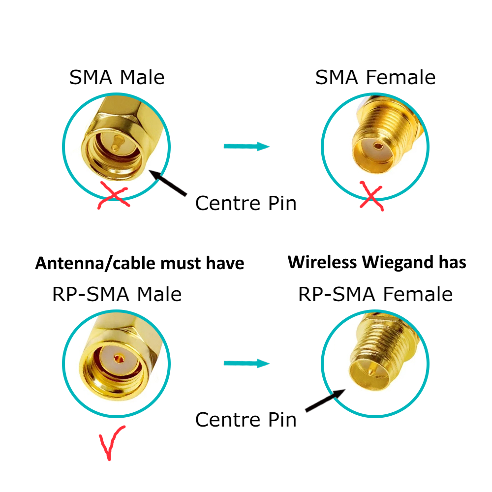 Wireless Wiegand (WW) has RP-SMA-Female antenna connector, therefore antenna or any cable should have RP-SMA-MALE connector toward the WW